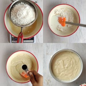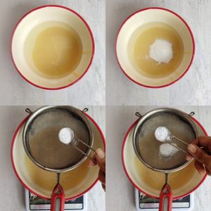 - Step 3 • In a bowl, strain flour, baking powder, baking soda and keep aside.